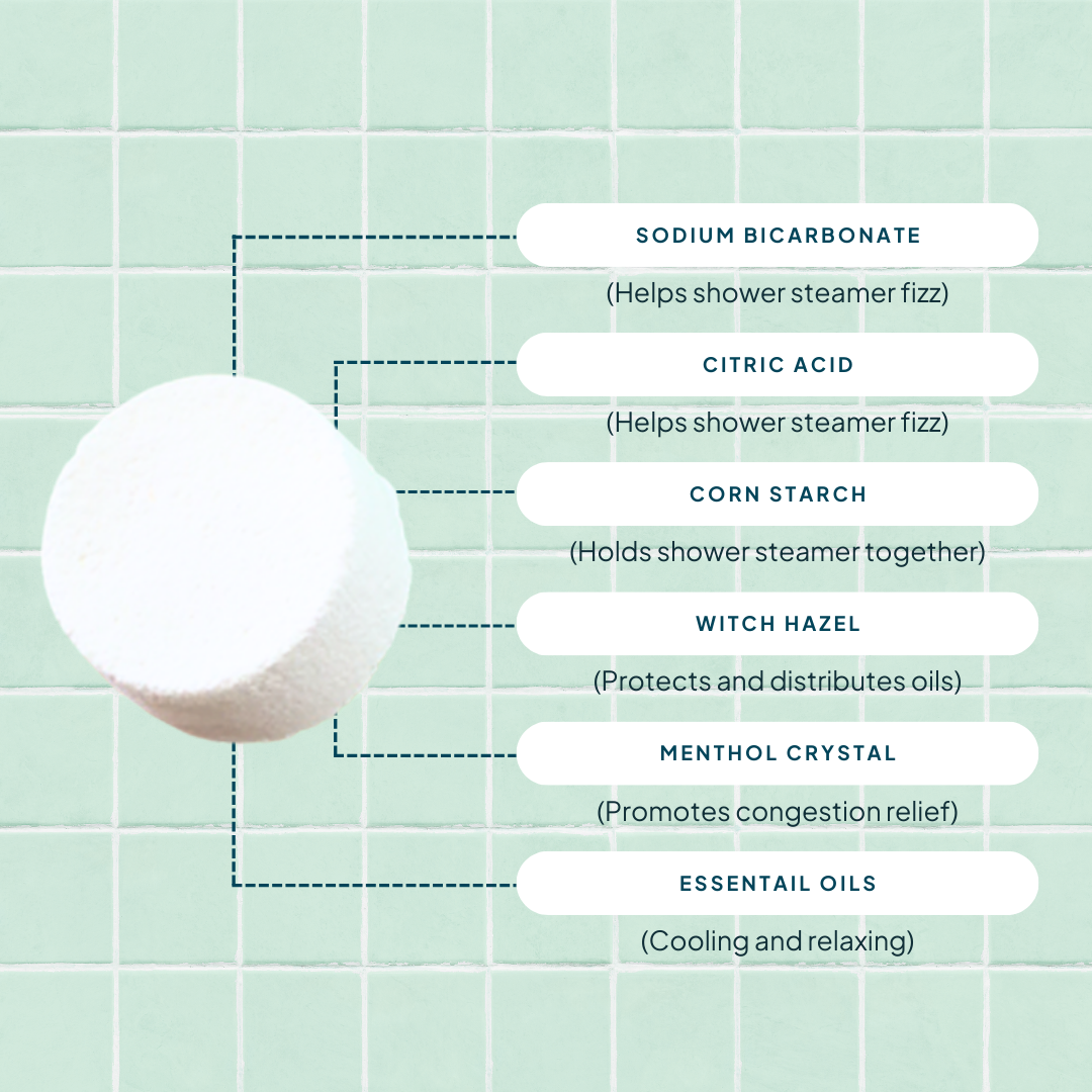 Sodium Bicarbonate (helps shower steamer fizz), Citric Acid (helps shower steamer fizz), Corn Starch (holds the shower steamer together and slows dissolving time), Witch Hazel (protects and distributes oils ), Menthol crystal (promotes congestion releif),Eucalyptus essential oil (cooling and relaxing).
