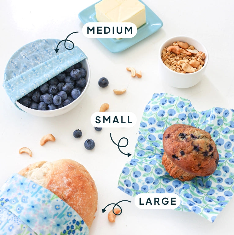 Size: 25cmx25cm. Great for wrapping small snack pouches, medium size bowls, containers, blocks of cheese, baked goods, cut vegetables, and more!